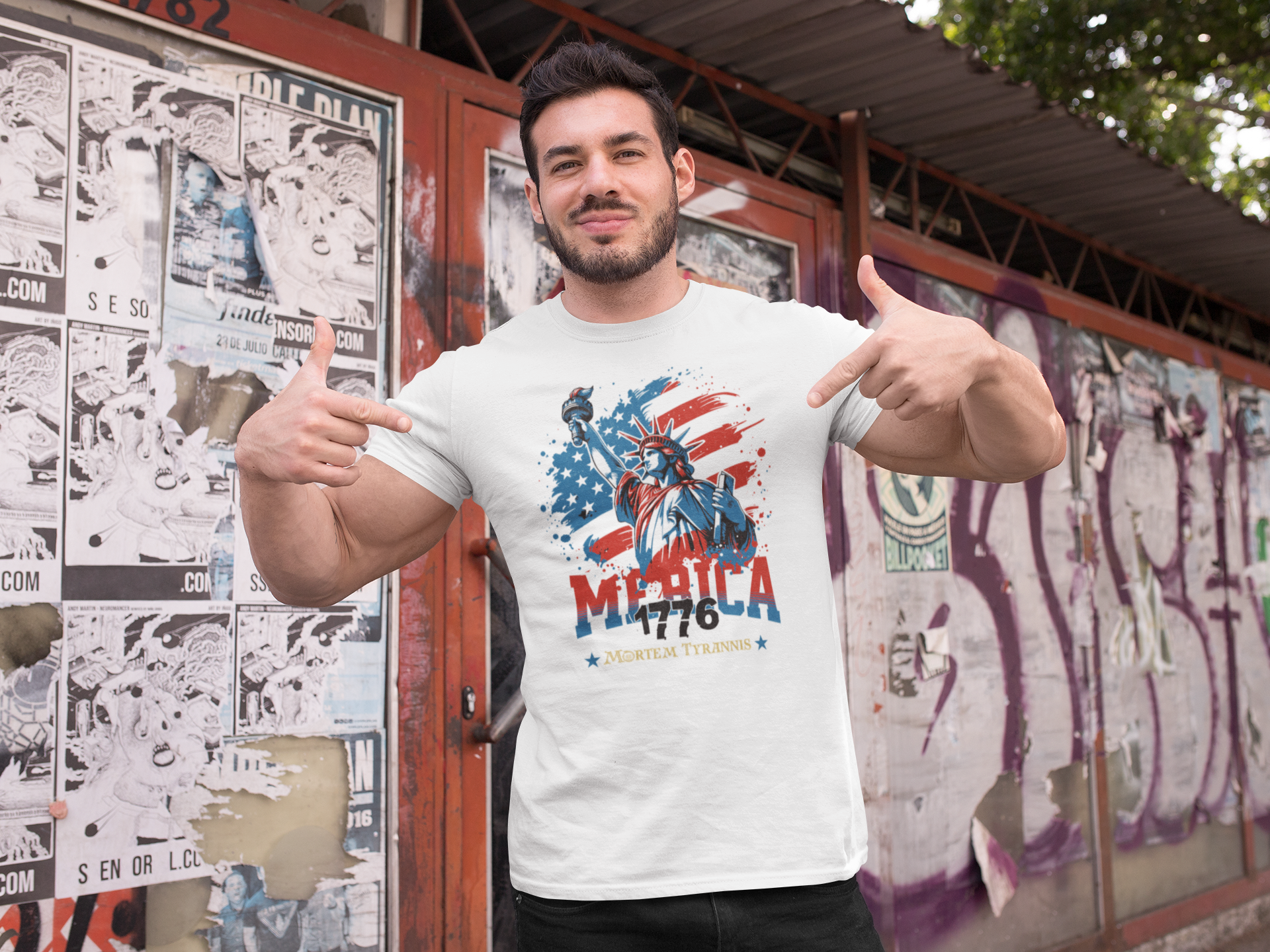Unleash your patriotic pride with the "Merica" T-Shirt! Featuring the iconic Statue of Liberty against a bold American flag backdrop, this design roars with freedom, inspired by the spirit of liberty. With "Mortem Tyrannis" (meaning "Death to Tyrants") as its battle cry, it’s proudly Made in the USA with premium craftsmanship. Grab yours!