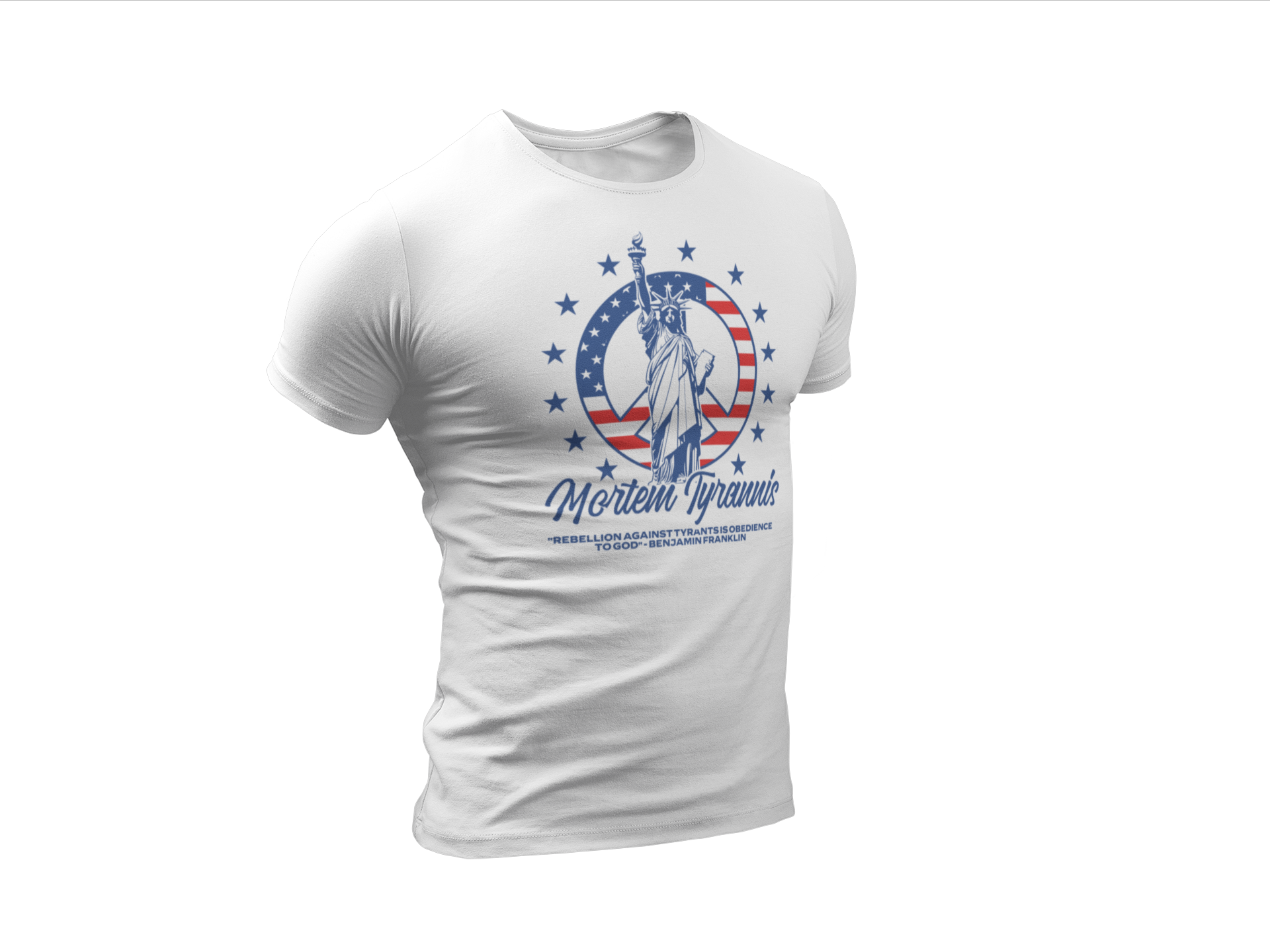 Looking to make a bold statement? Our “LiberTee” is here to inspire! Featuring a striking design of Lady Liberty encircled by a patriotic peace sign, this shirt embodies the spirit of rebellion and liberty. The powerful quote, “Rebellion against tyrants is obedience to God” by Benjamin Franklin, reminds us of the timeless fight for freedom. Proudly Made in the USA