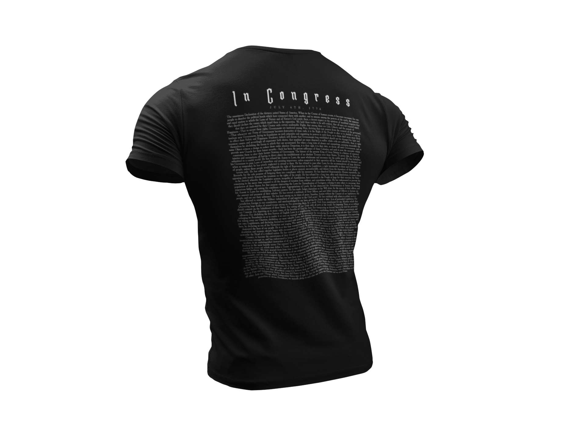 Wear your patriotism proudly with our 100% Made in the USA T-shirt, showcasing the full Declaration of Independence text on the back and the bold Mortem Tyrannis Flag logo on the front. Perfect for patriots, history lovers, and freedom fighters!